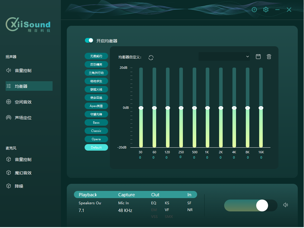 均衡器(qì)功能(néng),翔音(yīn)科(kē)技(j↓♥→✔ì)通(tōng)過自(zì)研的(de)均衡器(qì)算(suàn)法設δπ← 置多(duō)達10個(gè)單獨頻(pín)段,用(yòng)戶可(kě)以通(t≥✔ōng)過改變不(bù)同頻(pín)率的(de)增益或衰減,靈活÷調節低(dī)音(yīn)、高(gāo)✔≠'音(yīn)和(hé)語音(yīn)頻(pín)率,也(yě)可♦γδ (kě)以通(tōng)過Default自(z© ♠Ωì)定義音(yīn)效。